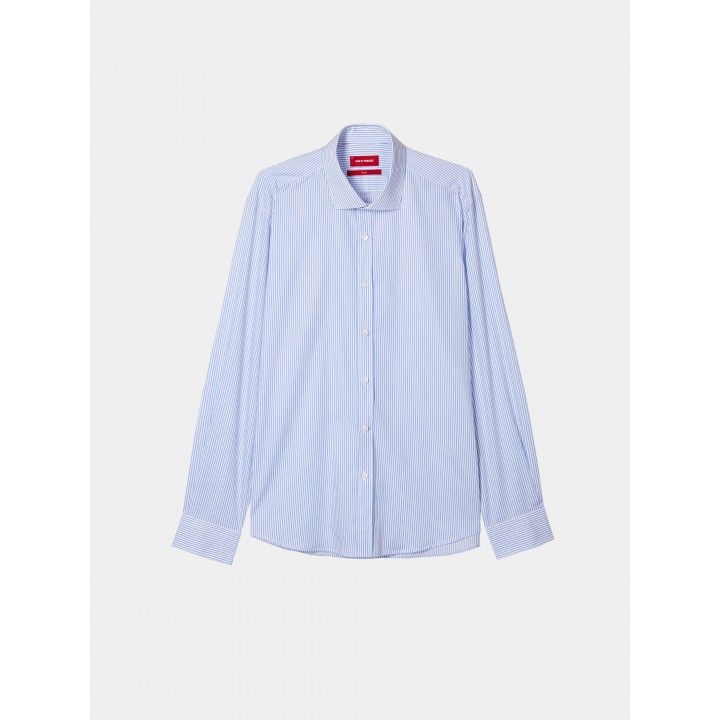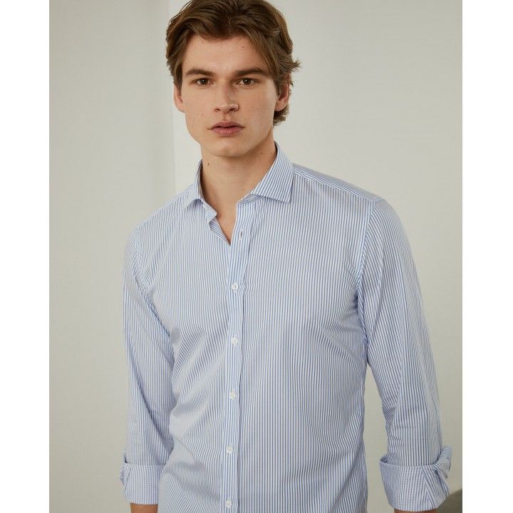 Esta camisa slim fit de popelin con estampado de rayas , cuello recortado. Se abrocha con botones en la parte delantera y en los puños. Confeccionada en algodón para mayor comodidad y suavidad.