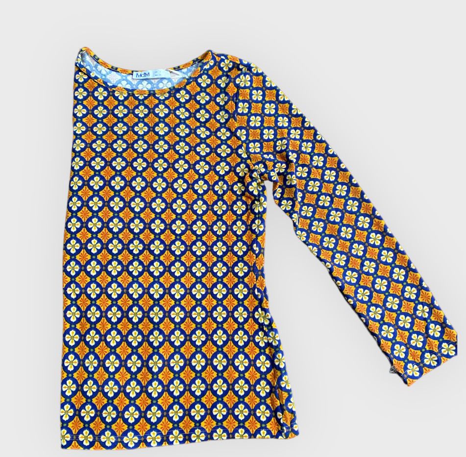 Camiseta de punto, estampado dibujo azulejo. Punto suave. Manga larga. Diseño evassé.