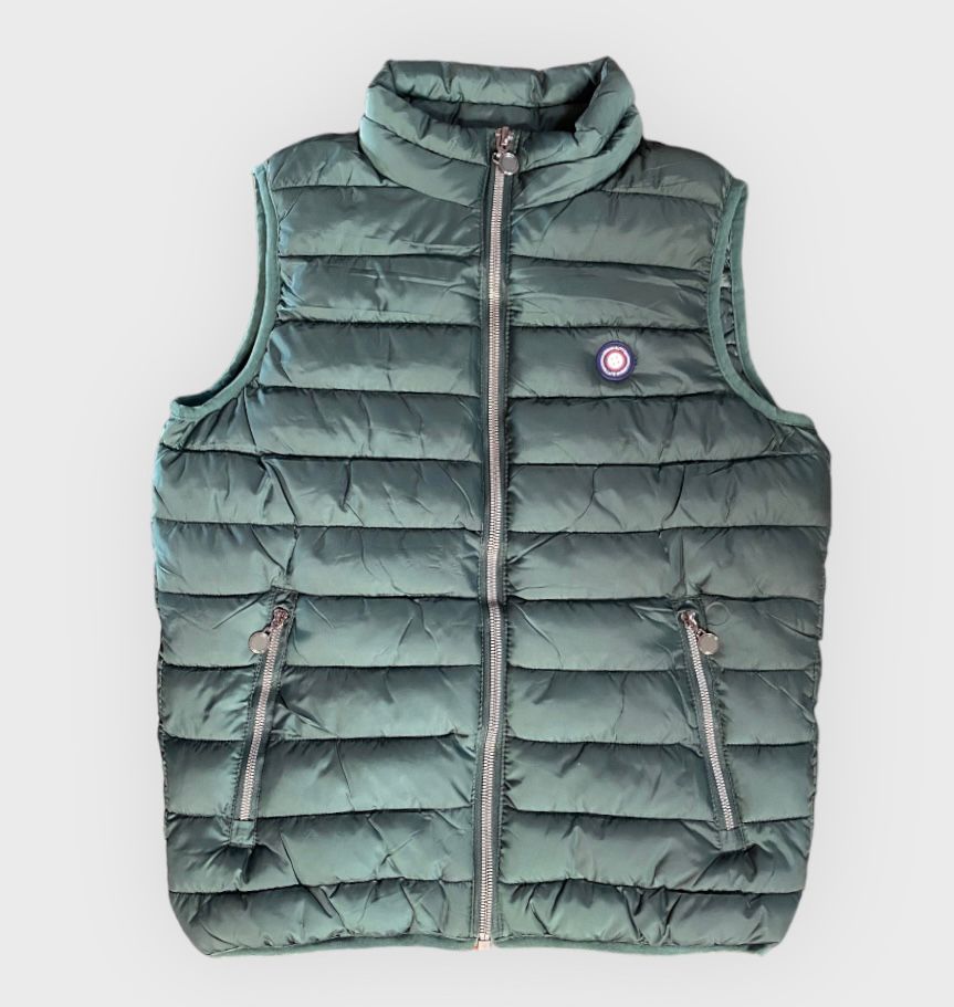 Chaleco acolchado en color verde botella, cuello subido y cierre con cremallera metálica, bolsillos a la altura de la cintura. Acabado con vivo de algodón elástico en la sisa y cintura.