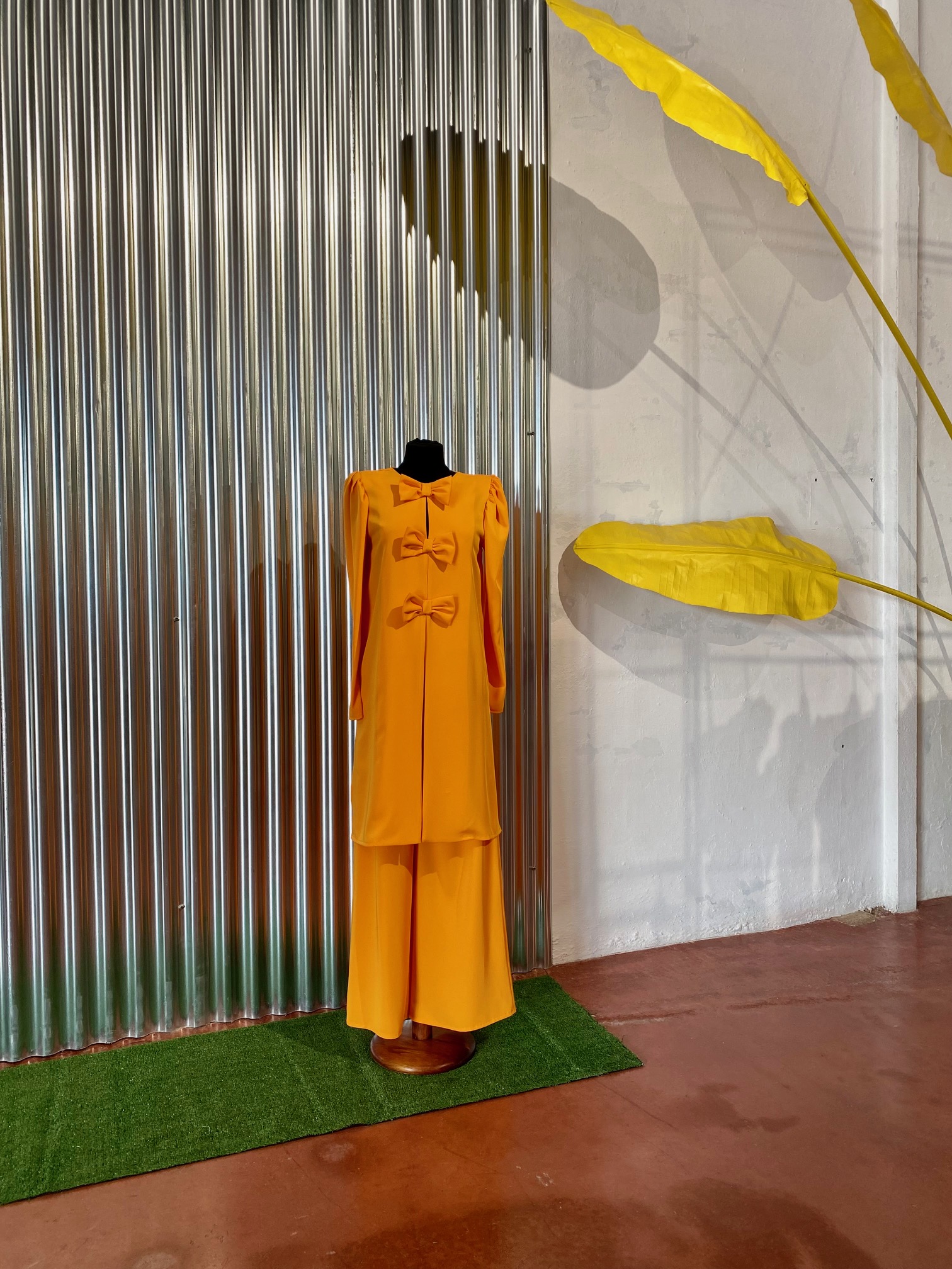 Conjunto de Blusón y Pantalón, color Mango. Cuello a la caja y abertura delantera con detalle de lazos sobre el pecho, manga larga jamonera. Pantalón de pata de elefante.