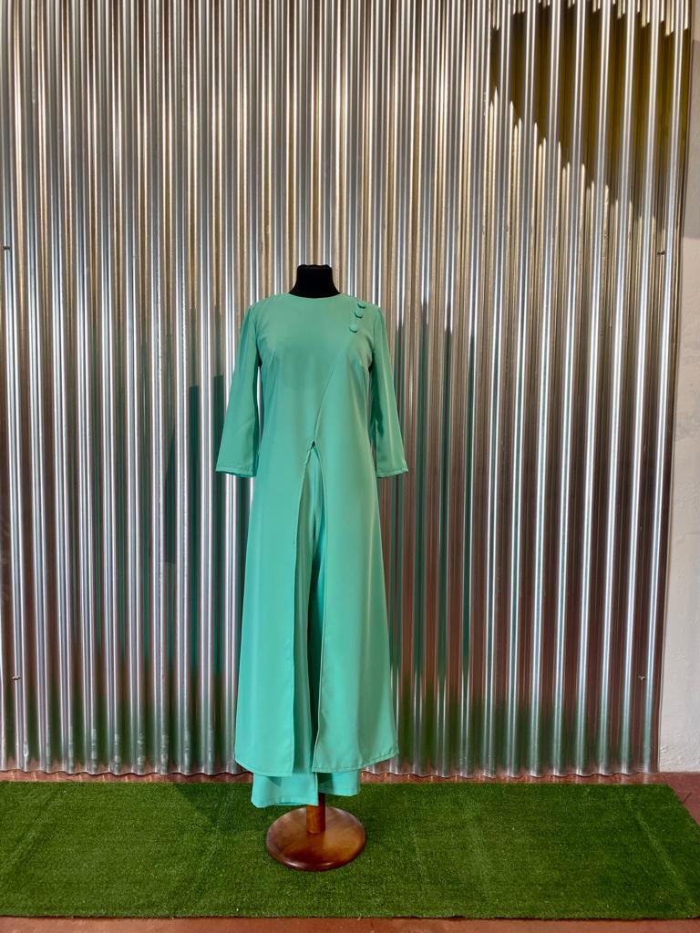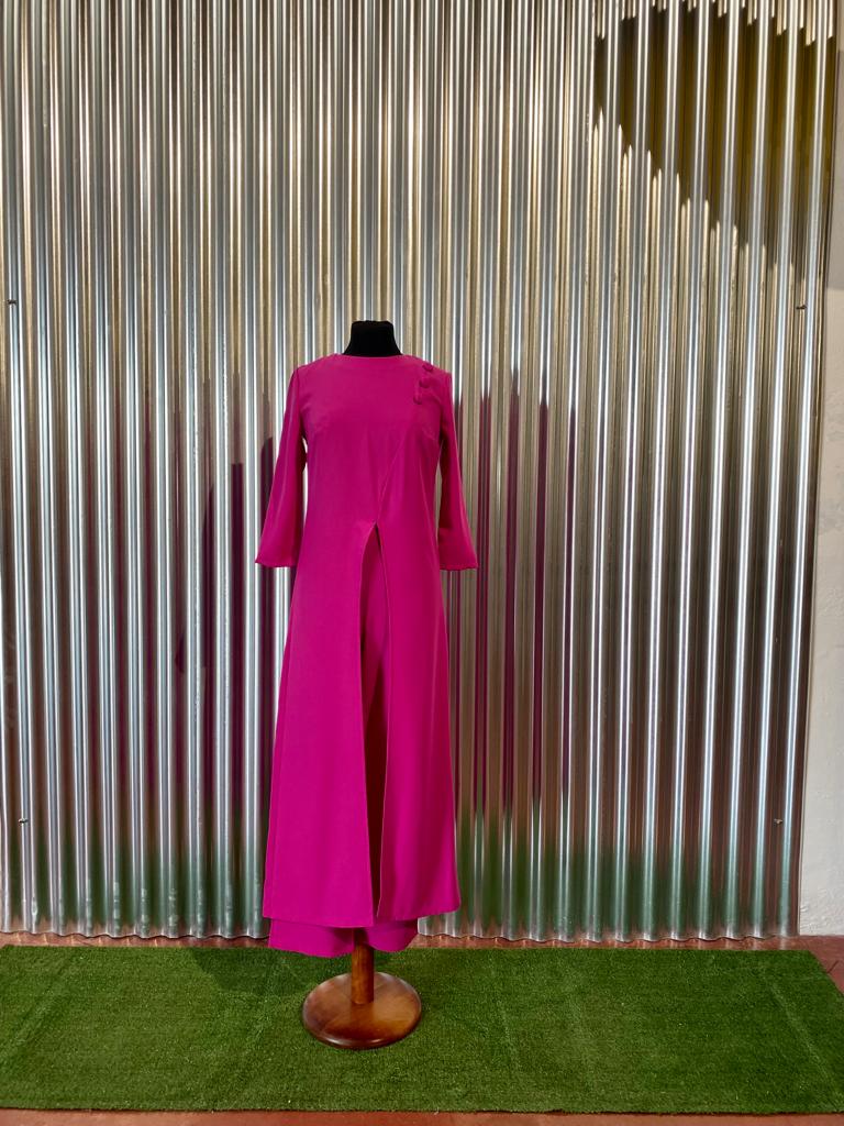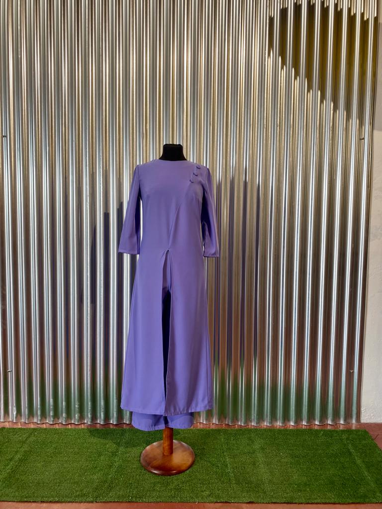 Conjunto pantalón y blusón. Blusón manga francesa con abertura delantera y detalle de botones sobre el hombro. Pantalón de corte recto.