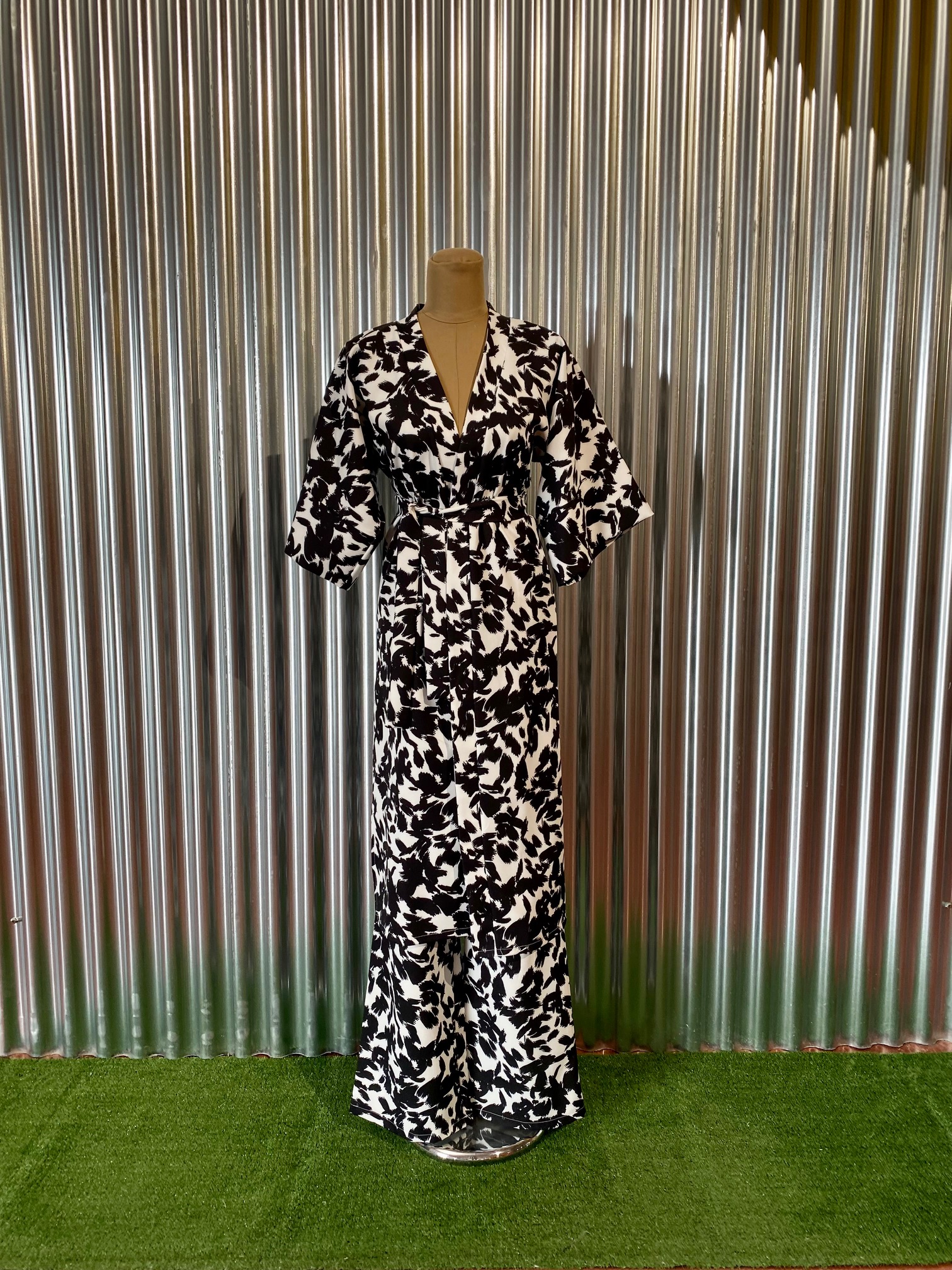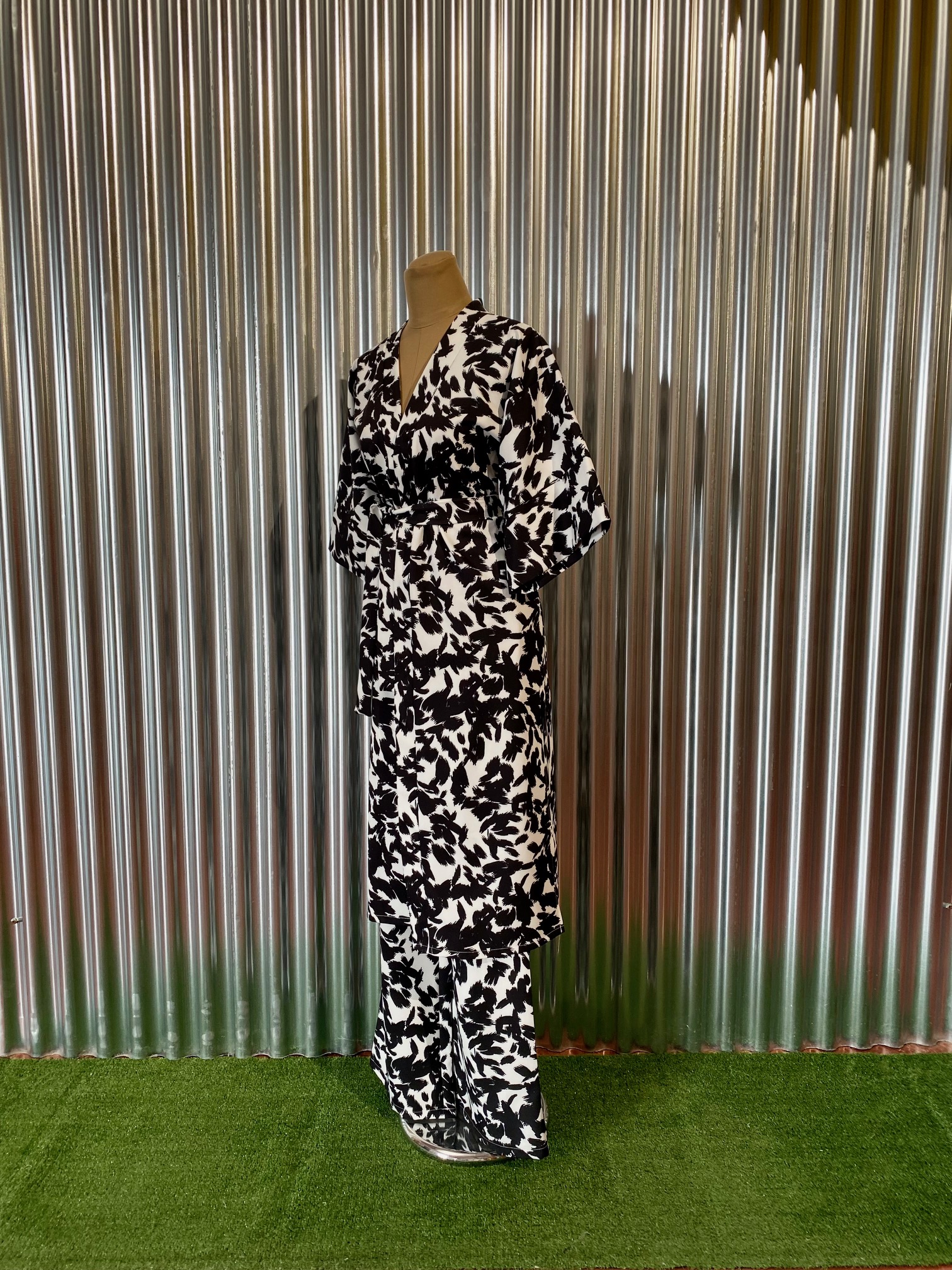 Conjunto chaqueta y pantalón. Chaqueta cruzada estilo kimono y pantalón de pata ancha, estampado floral blanco y negro.