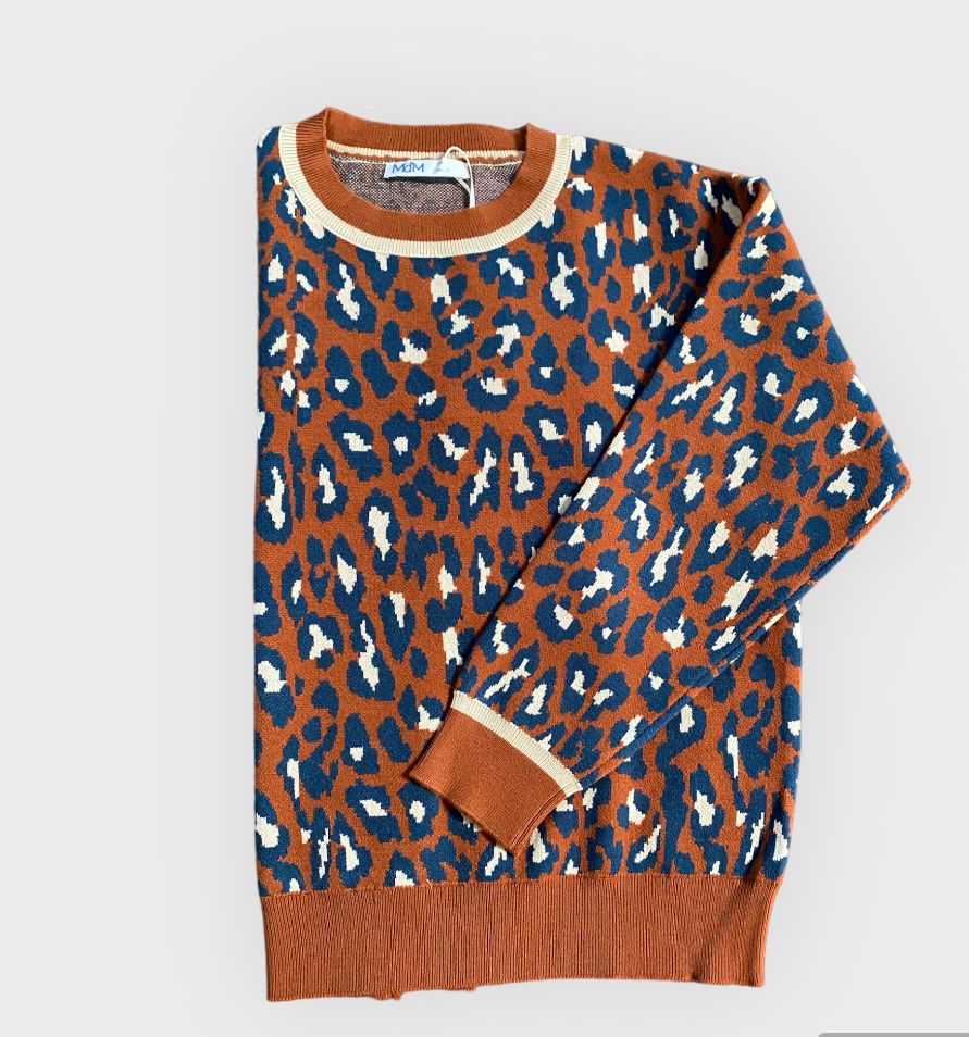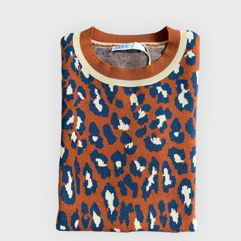 Jersey cuello a la caja. Estampado animal-print leopardo azul. Manga larga. Diseño recto.