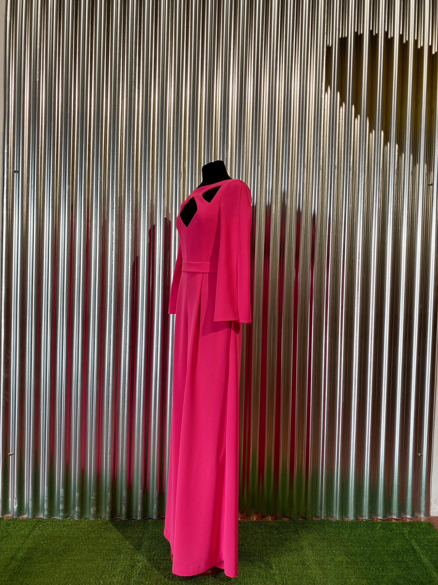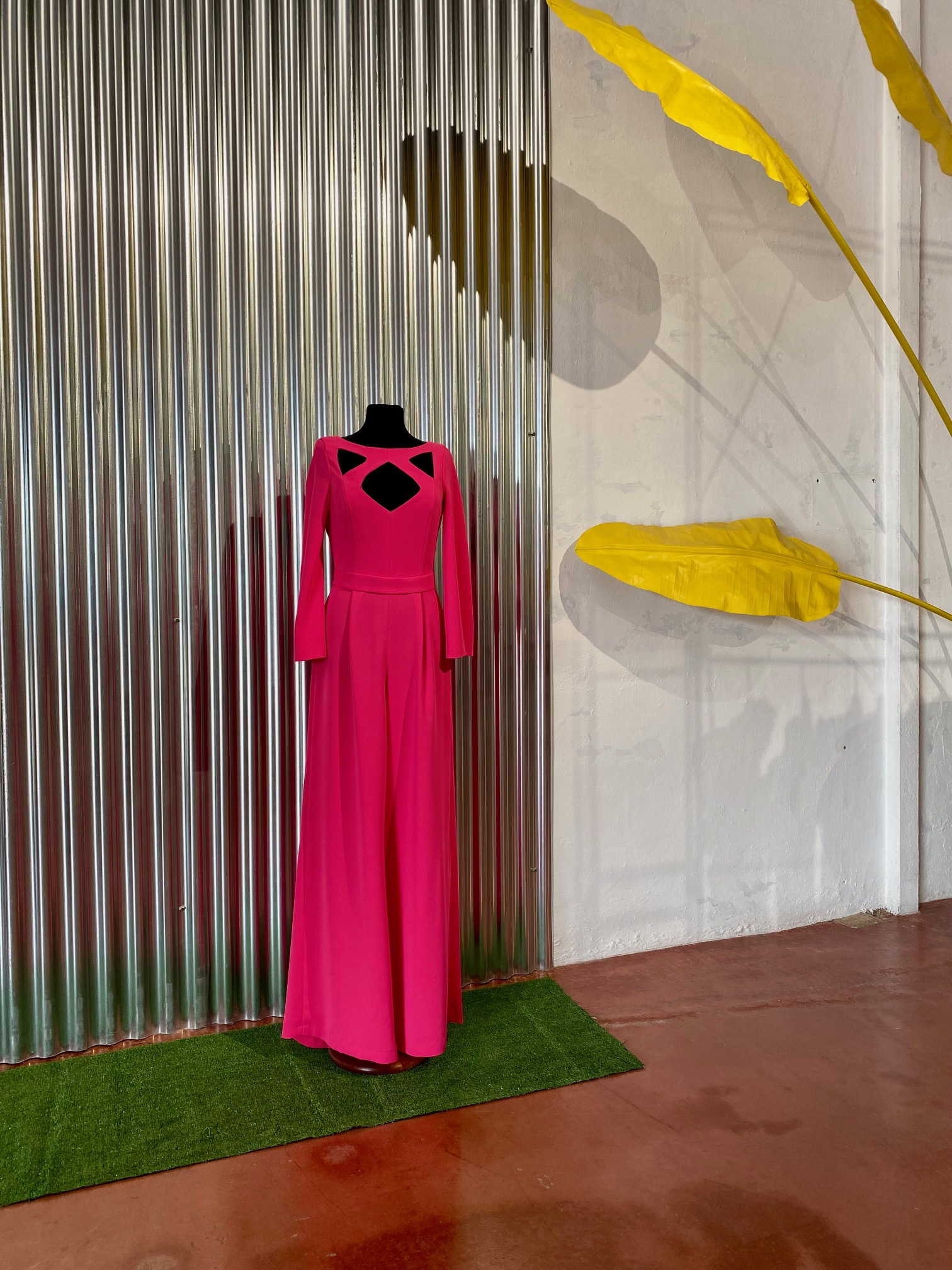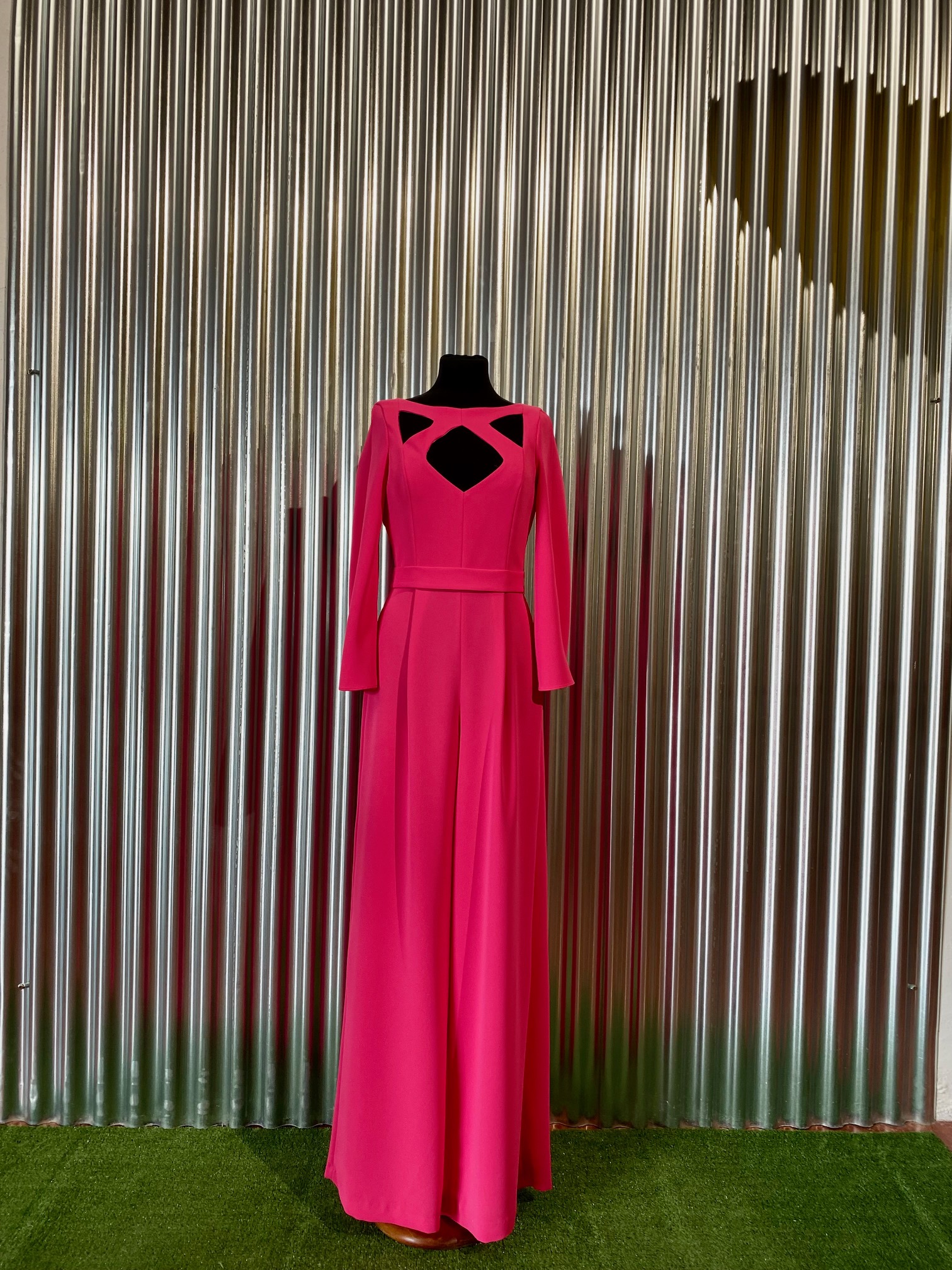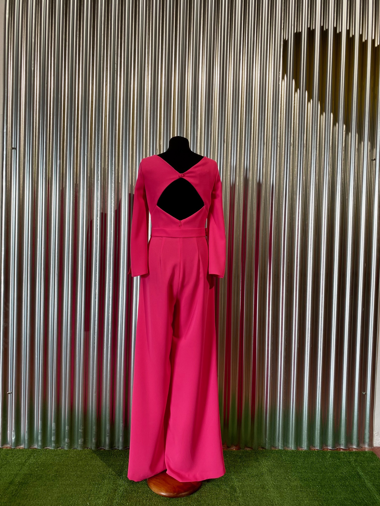 Mono color fucsia, con aperturas en escote y espalda. Manga larga con aperturas laterales. Pantalón de pata ancha con pinza en cintura.