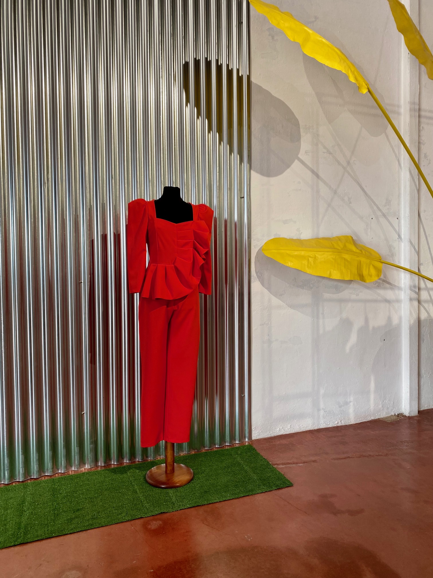 Mono con volante tableado desde el hombro a la cintura. Manga francesa, escote de corazón, pierna recta.