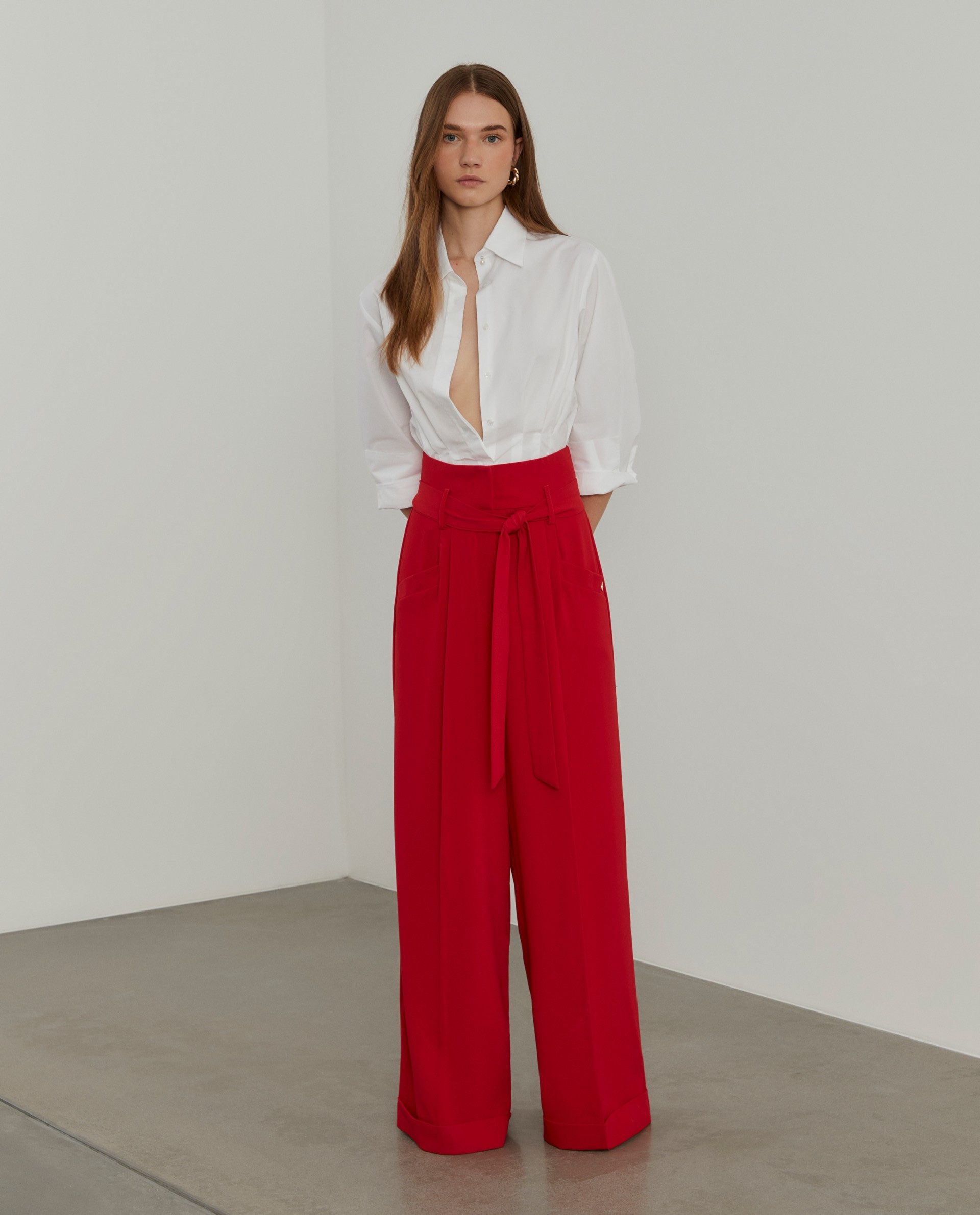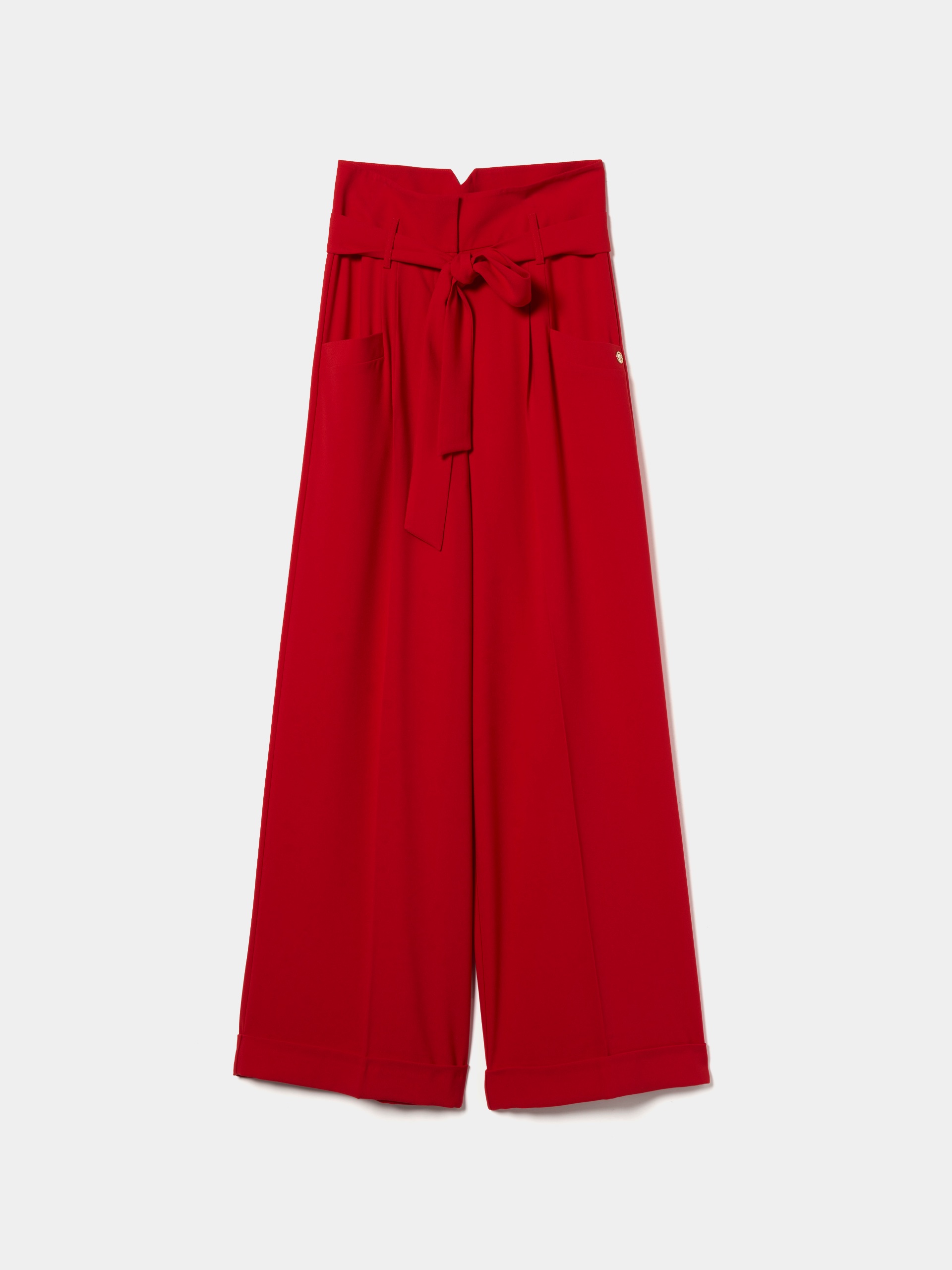 Pantalón de corte palazzo, de la marca Lion of porches, en tejido de crepe con caída, cintura alta con cinturón a juego.