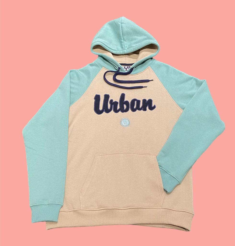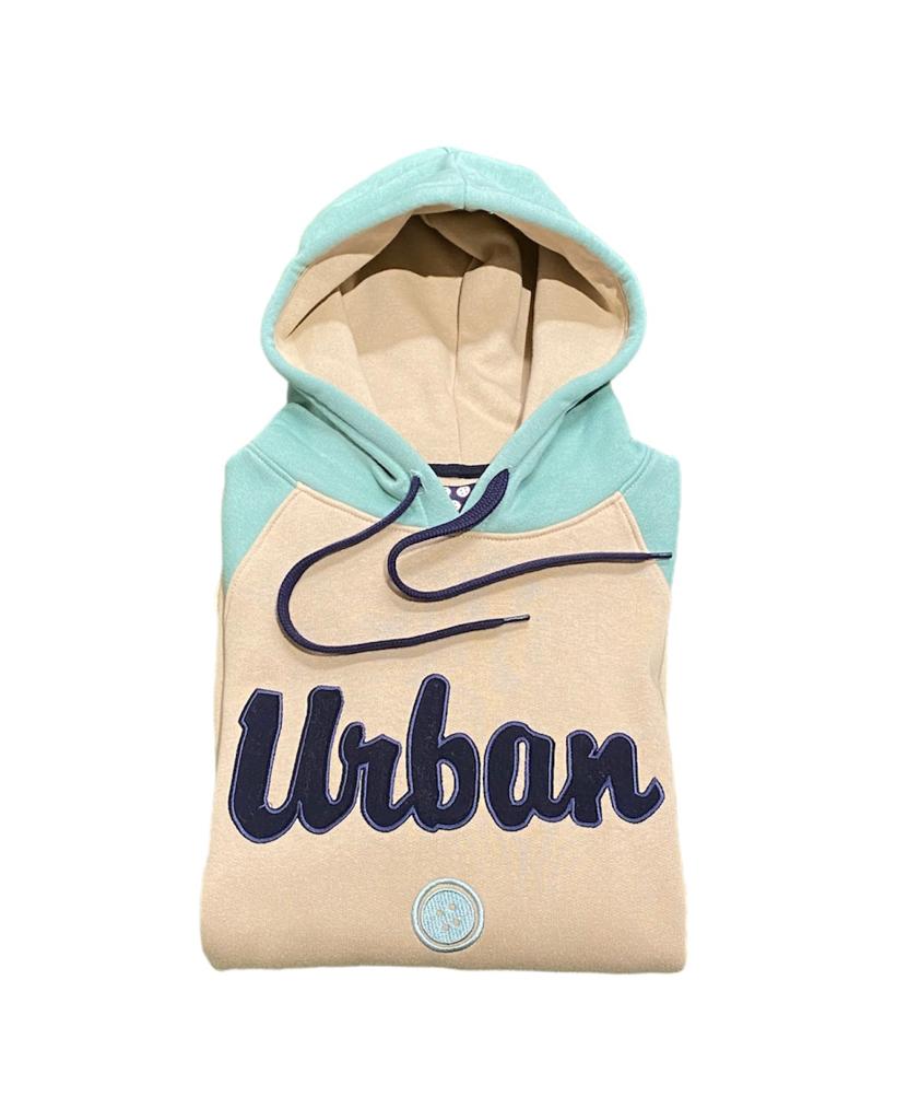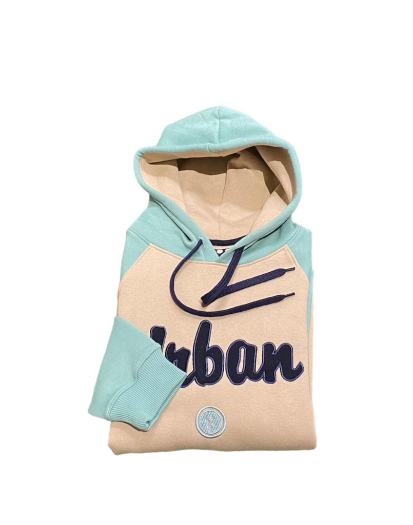 Sudadera bicolor combinada en beige y verde menta, con caucha y detalle de letras bordadas en azul marino sobre el pecho. Cuenta con bolsillo delantero al estilo canguro, manga larga y puños y bajos en acabado elástico. Corte regular fit.