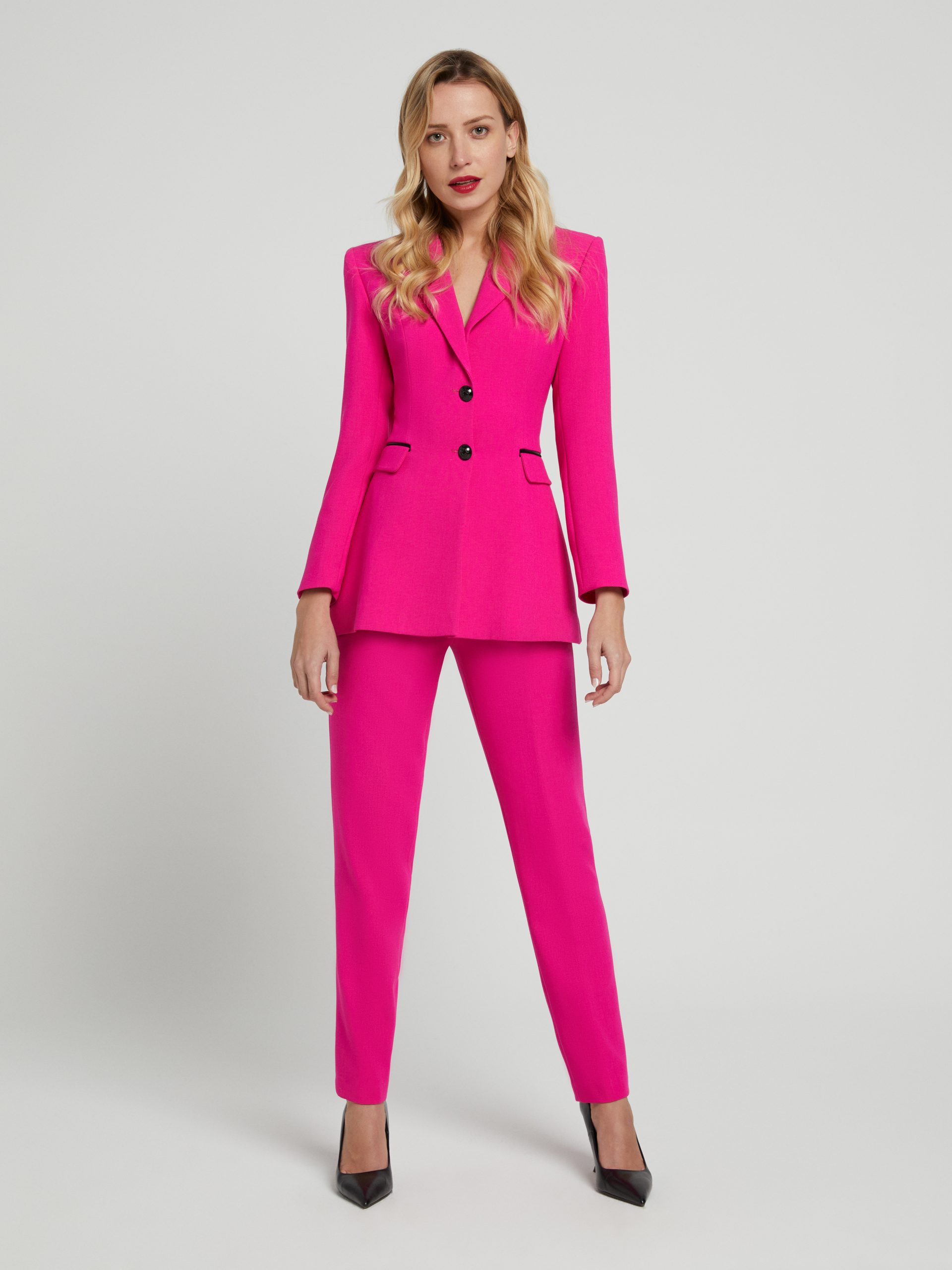 Traje de la firma Laura Bernal, en color rosa fucsia, cuello solapa y bolsillos con tapetas y detalles en negro. Pantalón corte capri.