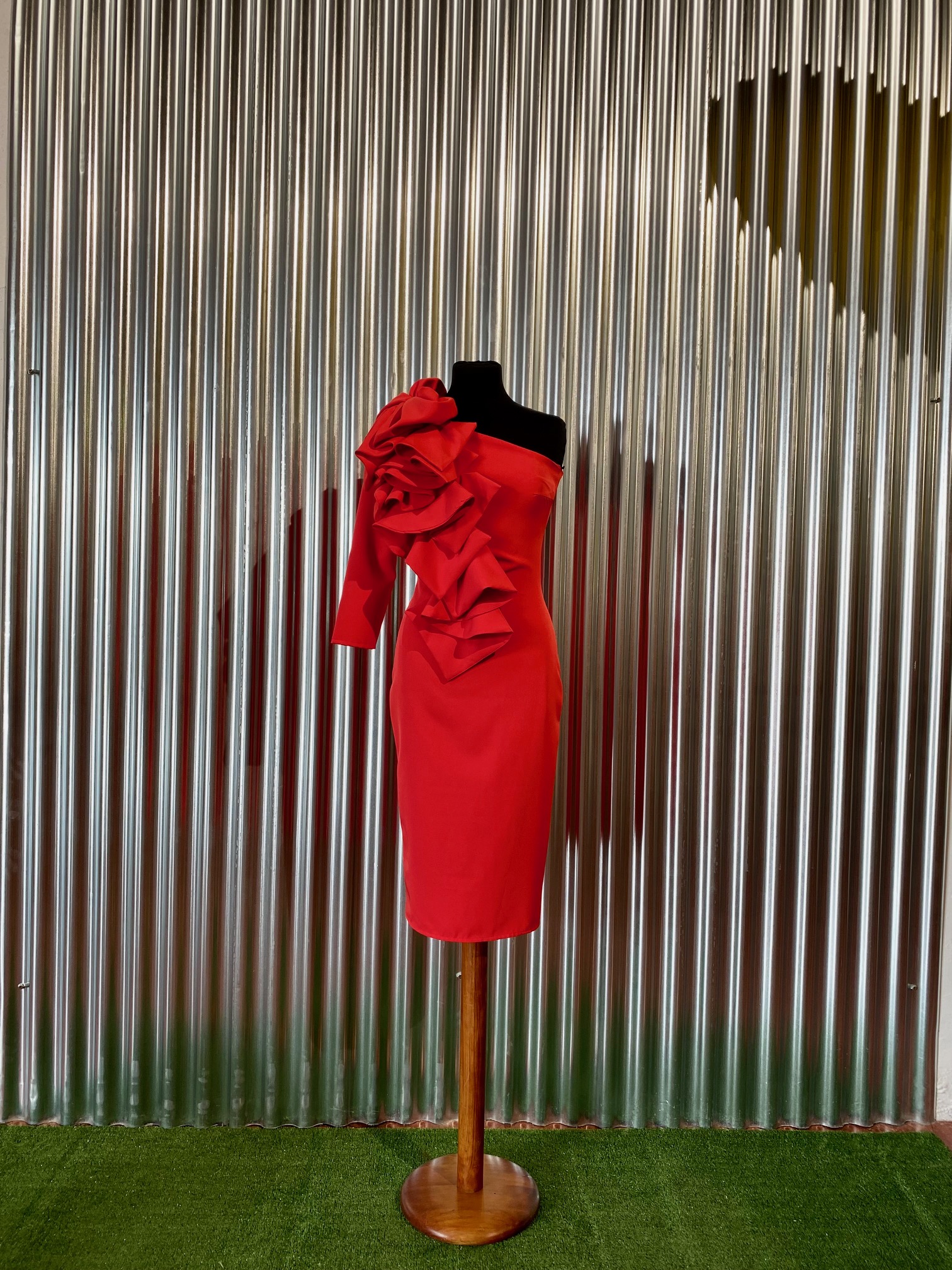 Vestido rojo con escote asimétrico y manga larga. Adorno en forma cascada de volantes desde el hombro.