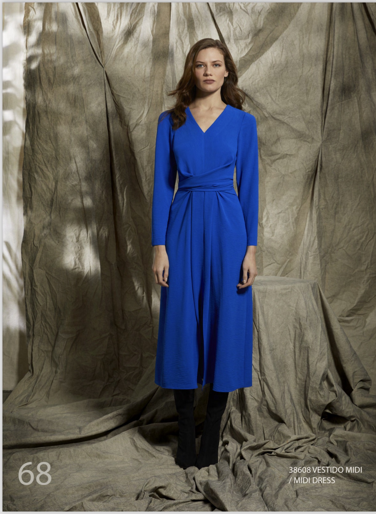 Vestido azul, con escote de pico y lazada cruzada a la cintura. Marca Laura Bernal.