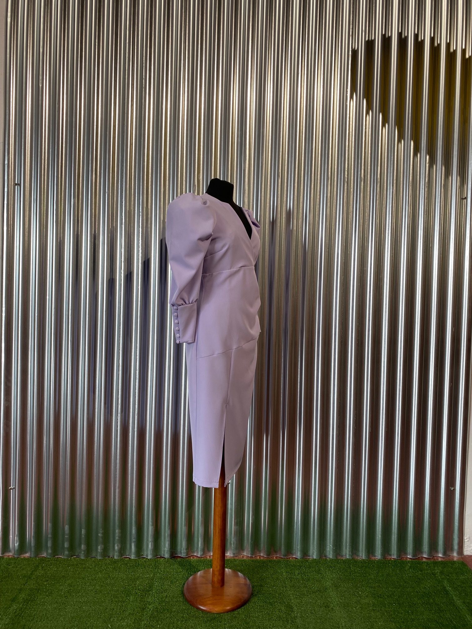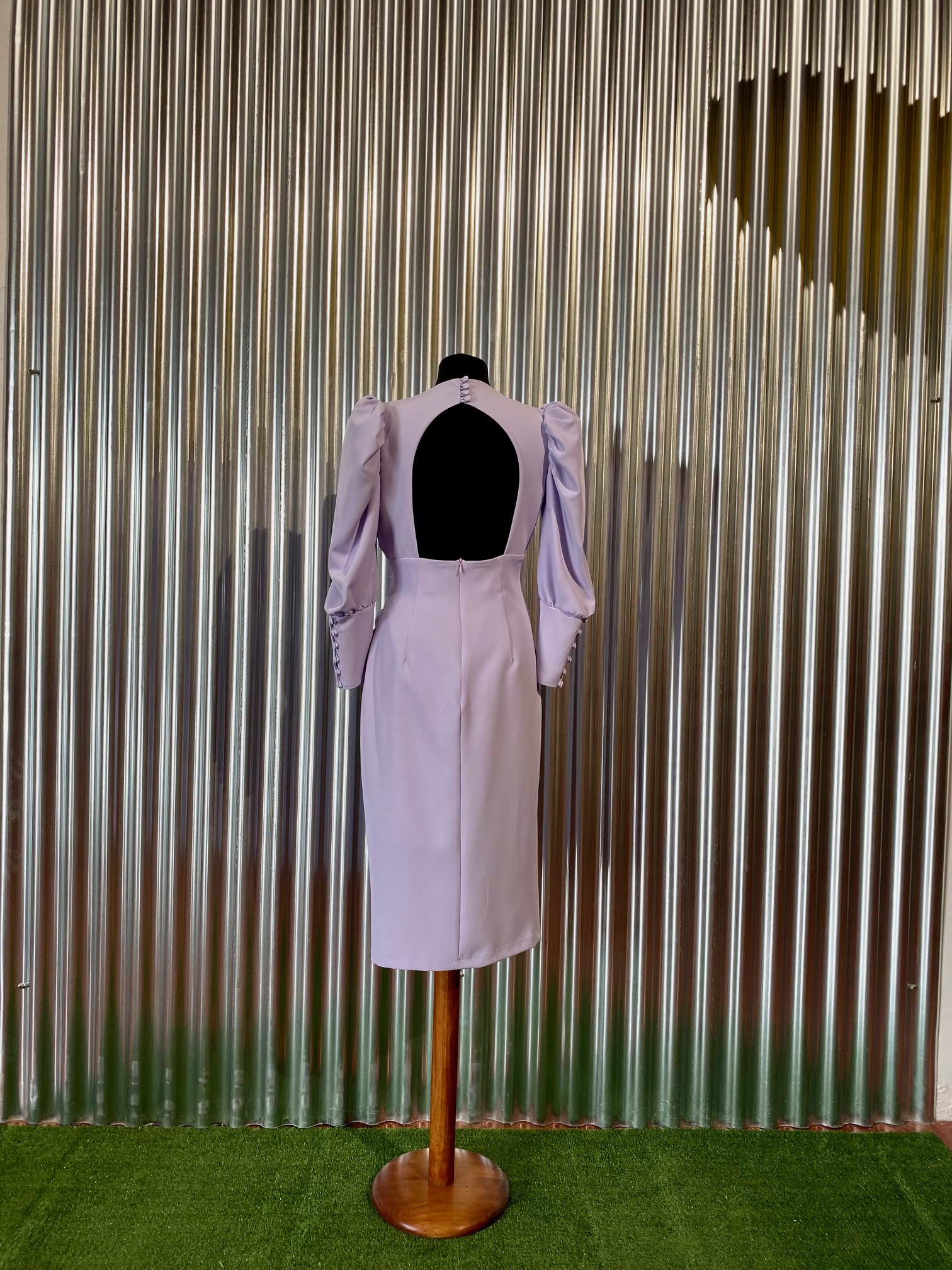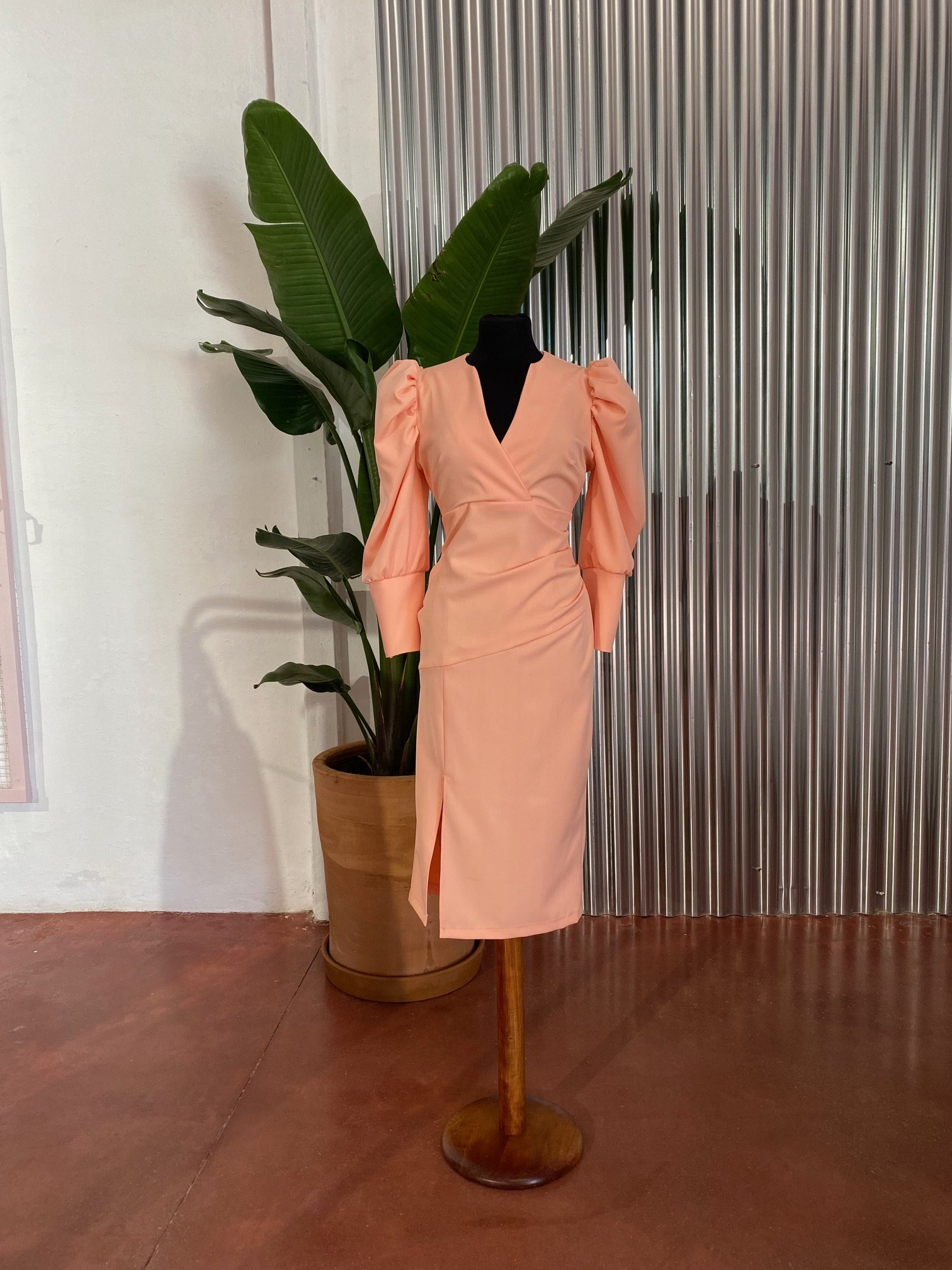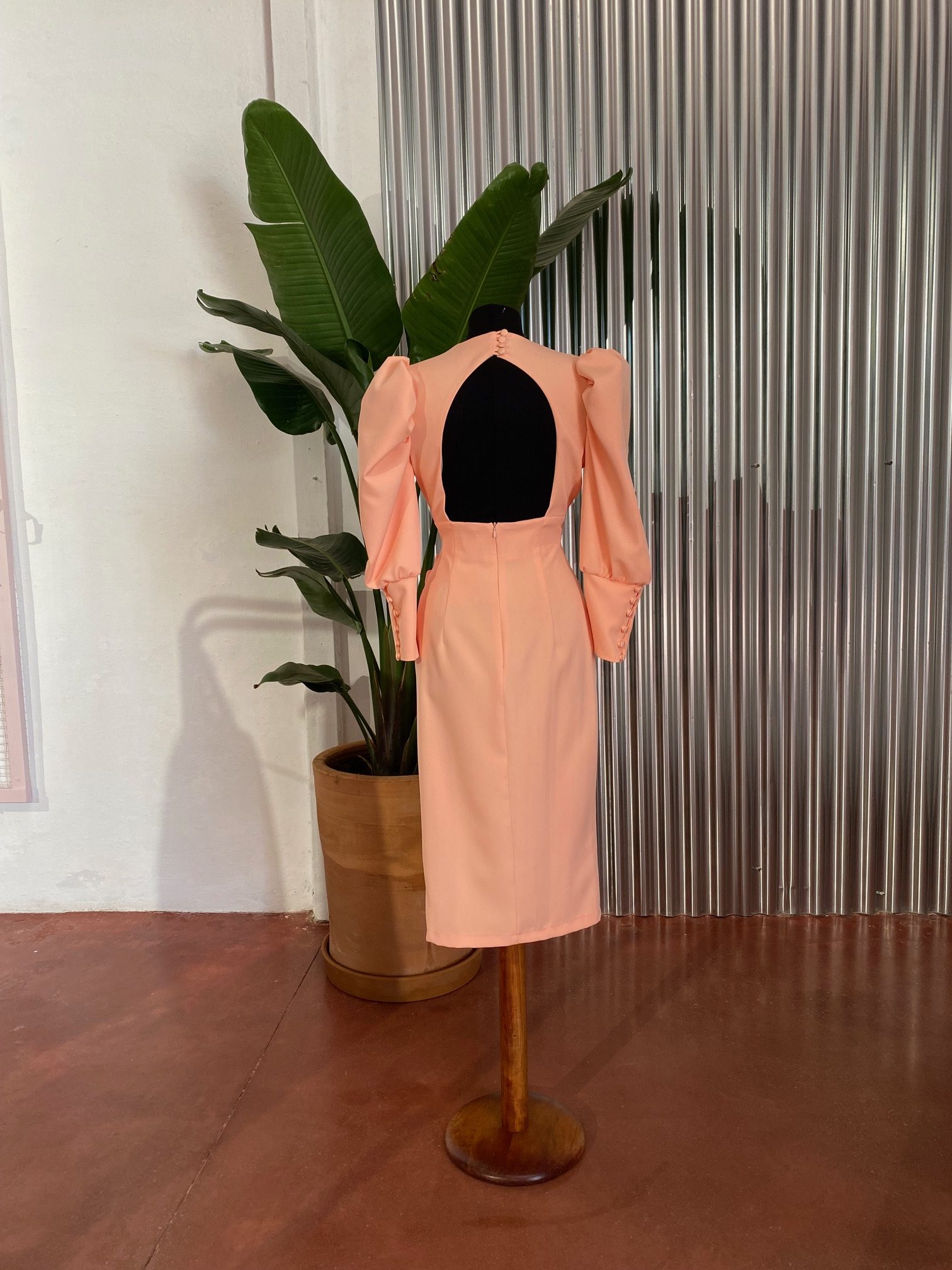 Vestido midi, manga jamonera, escote de pico cruzado, detalle de espalda abierta.